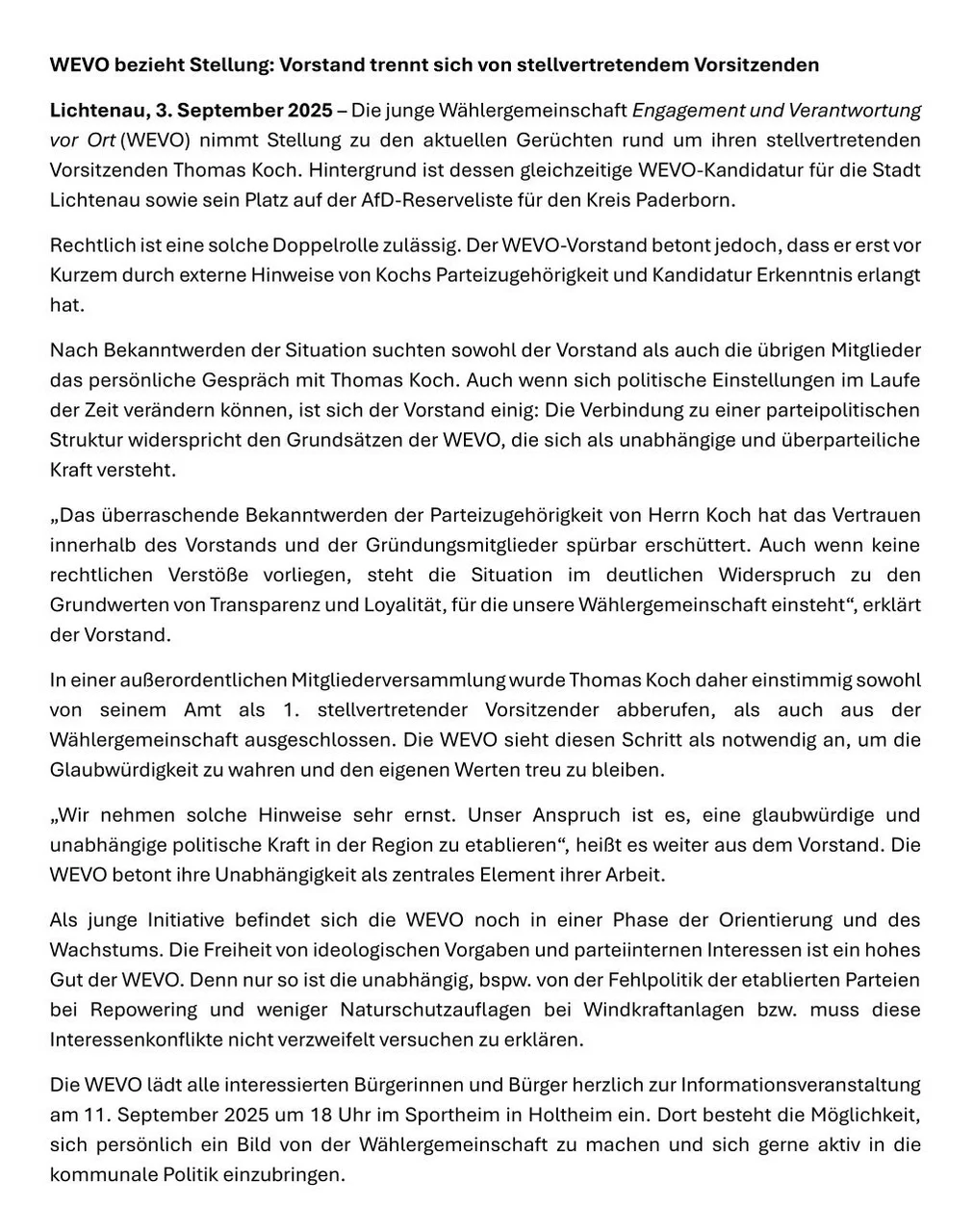 Pressemitteilung: WEVO-Vorstand trennt sich von stellvertretendem Vorsitzenden
